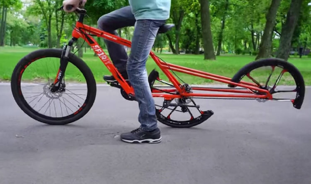 यो विचित्रको साइकलमा अगाडिको पूर्ण तर पछाडिको दुई वटा आधा पांग्रा छन् र तिनीहरूले अगाडिकोले जस्तै काम गर्छन् ।