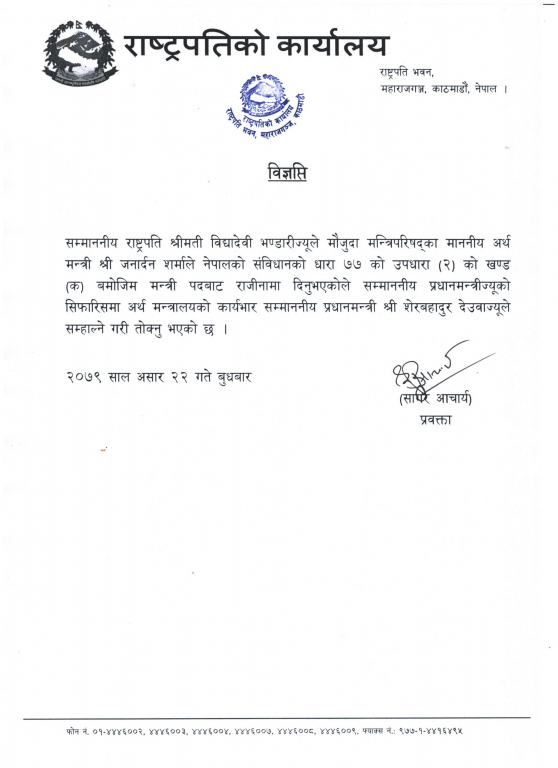 शर्माले राजीनामा दिएपछि राष्ट्रपति विद्यादेवी भण्डारीले संविधानको धारा ७७ को उपधारा (२) अनुसार देउवालाई अर्थमन्त्रालयको जिम्मेवारी तोकेकी हुन् ।