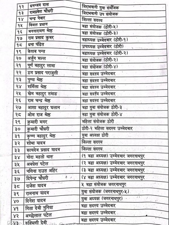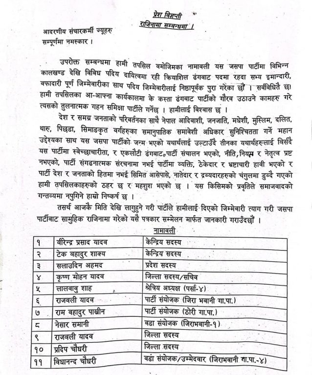 शनिबार वीरगञ्जमा पत्रकार सम्मेलन गर्दै केन्द्रीय सदस्य वीरेन्द्र यादव र टेकबहादुर शाक्य, प्रदेश सदस्य सलाउदिन अहमद, जिल्ला सदस्य एवं जगरथापुर गाउँपालिका अध्यक्षका उम्मेदवार कृष्ण मोहन यादव लगायतले पार्टी परित्याग गरेका हुन् ।