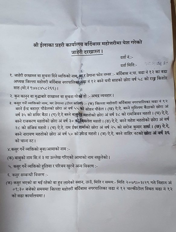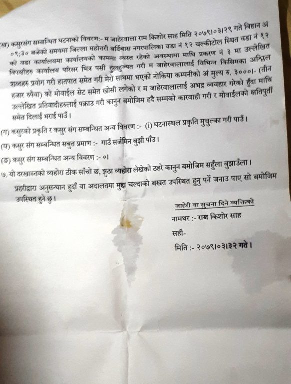 वडाध्यक्ष साहले आइतबार नै पीडकहरूविरुद्ध प्रशासनमा किटानी जाहेरी दिएका छन् । अभद्र व्यवहार कसुरअन्तर्गत दिएको उक्त किटानी जाहेरीमा स्थानीय सोहन पौडेल, समीर बैठा, रामनवीन महतो, विमलेश महतो, सन्जिव महतो, सरोजकुमार शर्मा, उपेन्द्र महतो र चान्द नट संलग्न भएको बताइएको छ ।