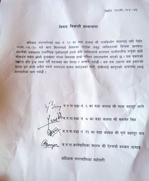 राजनीतिक प्रतिशोध लिने उद्देश्यले नियोजित ढंगबाट घटना भएको भन्दै दोषीलाई हदैसम्मको कारबाही हुनुपर्ने उनीहरूको माग छ । आइतबार संयुक्त विज्ञप्ति निकाल्दै वडाध्यक्ष शमशेर सिंह, पदमबहादुर आले, पूर्णबहादुर बल र कार्यपालिका सदस्य ऐश्वर्या बम्जन तामाङले पूर्वाग्राही ढंगले यस्ता दुर्व्यवहारको घटना गराएको आरोप लागेको छ ।