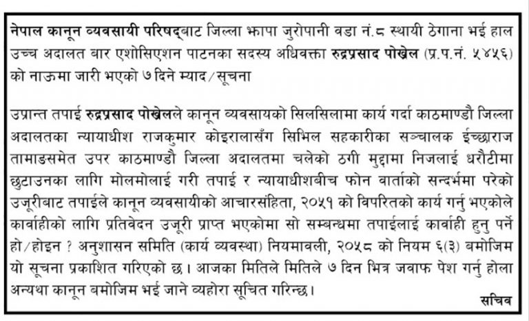 ‘तपाईं रुद्रप्रसाद पोखेलले कानून व्यवसायको सिलसिलामा कार्य गर्दा काठमाडौं जिल्ला अदालतका न्यायाधीश राजकुमार कोइरालासँग सिभिल सहकारीका सञ्चालक ईच्छाराज तामाङसमेत उपर काठमाडौं जिल्ला अदालतमा चलेको ठगी मुद्दामा निजलाई धरौटीमा छुटाउनका लागि मोलमोलाई गरी तपाईं र न्यायाधीशबीच फोन वार्ताको सन्दर्भमा तपाईंलाई कार्वाही हुनु पर्ने होरहोइन रु’ सार्वजनिक सूचनामा भनिएको छ, ‘अनुशासन समिति ९कार्य व्यवस्था० नियमावली, २०५८ को नियम ६९३० बमोजिम यो सूचना प्रकाशित गरिएको छ । आजका मितिले मितिले ७ दिन भित्र जवाफ पेश गर्नु होला अन्यथा कानून बमोजिम भई जाने व्यहोरा सूचित गरिन्छ ।’