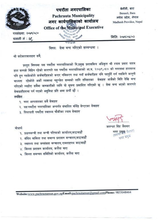 प्रमुख प्रशासकीय अधिकृत नहुँदा आर्थिक बर्ष २०७९र८० को नगरसभा समेत भएको छैन । यस्तै, करारमा नयाँ कर्मचारी पदपुर्ति तथा करार नविकरण समेत नहुँदा पचरौता नगरपालिकाको सेवा अवरुद्ध भएको हो ।