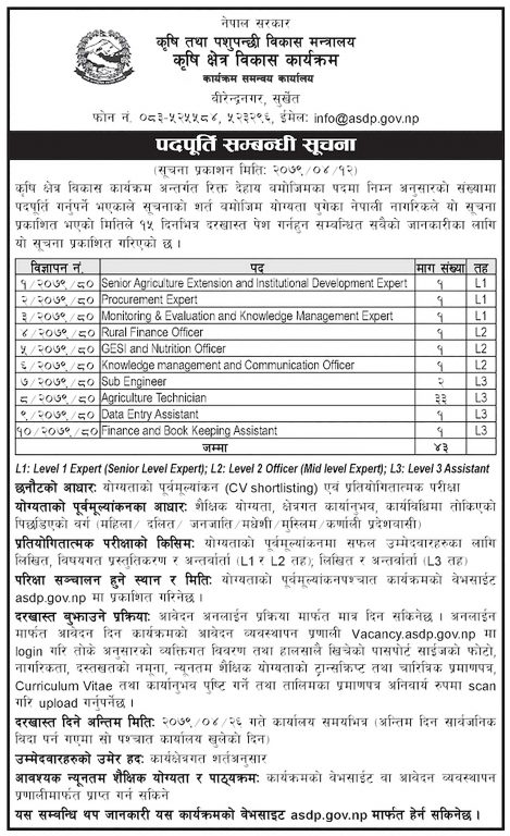 काठमाडौं, १२ साउन । कृषि क्षेत्र विकास कार्यक्रम समन्वय इकाइ सुर्खेतले कृषि प्राविधिकसहित ४३ जना कर्मचारी माग गरेको छ ।