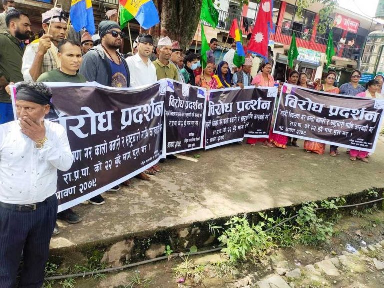 काठमाडौं, १८ साउन । राप्रपाले काठमाडौंसहित देशभरका सबै जिल्लामा भ्रष्टाचारविरुद्धमा कालोपट्टी लगाएर विरोध प्रदर्शन गरेको छ । बुधबार पार्टीनिकट सबै जनवर्गीय संगठनको संयुक्त आयोजनामा कालोपट्टी बाँधेर प्रदर्शन भएको राप्रपा प्रवक्ता तथा प्रचार विभाग प्रमुख मोहन श्रेष्ठले जानकारी दिए ।