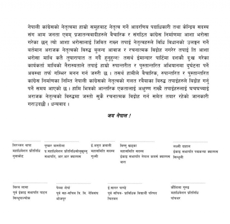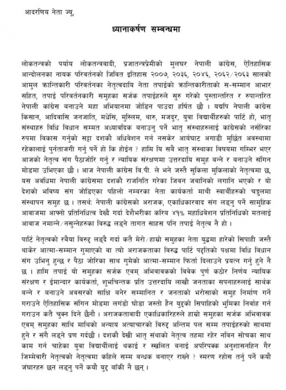 युवा नेताहरूले नेताहरु धनराज गुरुङ, गगन थापा, अर्जुननरसिंह केसी, डा. रामशरण महत, बलबहादुर केसी, सहमहामन्त्रीद्वय बद्रि पाण्डे, जीवन परियार, पूर्वकेन्द्रीय सदस्य हृदयराम थानी र नेविसंघका पूर्वअध्यक्ष गुरुराज घिमिरेलाई ध्यानाकर्षण पत्र बुझाएका हुन् ।
