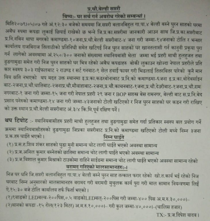 तस्करी गरेर ल्याइएको समान बरामद गर्ने क्रममा स्थानीय र प्रहरीबीच झडप भएको हुँदा स्थितिलाई नियन्त्रणमा लिन हवाइ फायर गरेकाे सप्तरीका प्रहरी प्रवक्ता माधवप्रसाद काफ्लेले जानकारी दिएका छन्। उनका अनुसार कुनै अप्रिय घटना हुन नदिन प्रहरीले ३ राउण्ड हवाइ फायर गरेको हाे ।