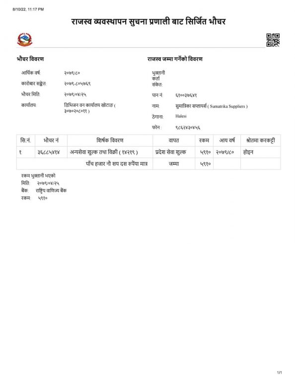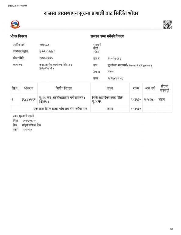 कृष्णकुमारी कार्कीको अख्तियारीले सुमात्रीका सप्लायर्सले ६६ बोट खयरको ११८०.७९ क्यूफिट (स्यापउड सहित) काठ निकासी गर्न इजाजत पाएको थियो । मुल्यअभिवृद्धि करबापत करदाता सेवा कार्यालयको खातामा २५ साउनमा रावाबैंकमा १ लाख ५३ हजार ५३० र प्रदेश सेवा शुल्कवापत सोही दिन आर्थिक प्रशासन शाखा, डिभिजन वन कार्यालयको नाममा रावाबैंक दिक्तेलमा ५ हजार ९१० रुपैयाँ दाखिला गरिएकोमा पुःन २८ साउनमा वडा कार्यालय बाहुनीडाँडालाई ८४३ क्यूफिटको प्रतिक्यूफिट २० रुपैयाँका दरले १६ हजार ८६० रुपैयाँ राजस्व तिर्नुपरेको राईले गुनासो गरे ।