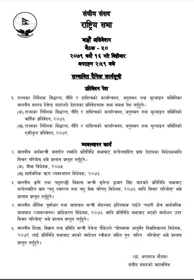 त्यस्तै, बीमा विधेयक २०७५, सार्वजनिक ऋण व्यवस्थापन विधेयक २०७६, पशु स्वास्थ्य तथा पशु सेवा परिषद् विधेयक, २०७६ माथि विचार गरियोस् भन्ने प्रस्ताव, शहरी क्षेत्र सार्वजनिक यातायात व्यवस्थापन प्राधिकरण विधेयक, २०७६ माथि प्रतिनिधिसभाबाट भएको संशोधनमाथि विचार गरियोस् भन्ने प्रस्ताव प्रस्तुत गर्ने कार्यसूची रहेको छ ।