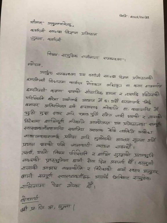 ‘विषम परिस्थिति र शान्ति सुरक्षाको प्रत्याभूति नभएको पुष्ठभूमिमा हामी सेवा दिन असमर्थन छौं,’ उनीहरूले राजीनामा पत्रमा लेखेका छन् ।