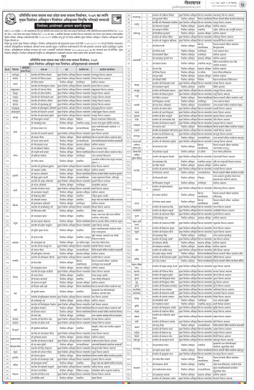 काठमाडौँ, ६ असोज । निर्वाचन आयोगले मुख्य निर्वाचन अधिकृत र निर्वाचन अधिकृत नियुक्त गरेको छ । ७७ जिल्लाका जिल्ला न्यायाधीशलाई सोही जिल्लाको मुख्य निर्वाचन अधिकृतमा नियुक्त गरिएको आयोगका प्रवक्ता शालिकग्राम शर्मा पौडेलले जानकारी दिए ।