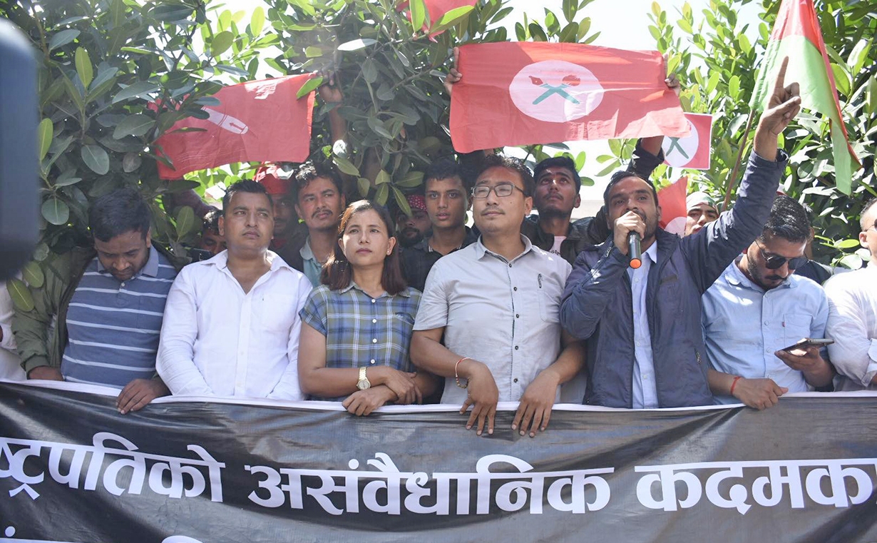 विहीबार काठमाडौंको माइतीघर मण्डलादेखि नयाँ बानेश्वरसम्म प्रदर्शन गरेका हुन् । सत्तारुढ दल निकट विद्यार्थीले राष्ट्रपतिको कदमलाई असंवैधानिक भन्दै विरोध गरेका हुन् ।