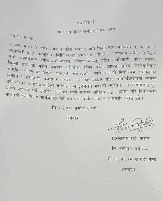 नेकपा माओवादी केन्द्र धनकुटाका सबै पदाधिकारीसहित जिल्ला कमिटीका सदस्यहरूले राजीनामा दिएका छन् । धनकुटाबाट प्रतिनिधित्व गर्ने केन्द्रीय नेताहरूसहित जिल्ला समन्वय समितिका सबै सदस्यले सामूहिक राजनीमा दिएका हुन् ।