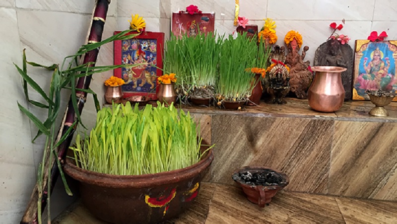 ‘कदली दाडिमी धान्या हरिद्रा मानकं कचु। विल्वाशोकौ जयन्ती च विज्ञेया नवपत्रिकाः ।।’
