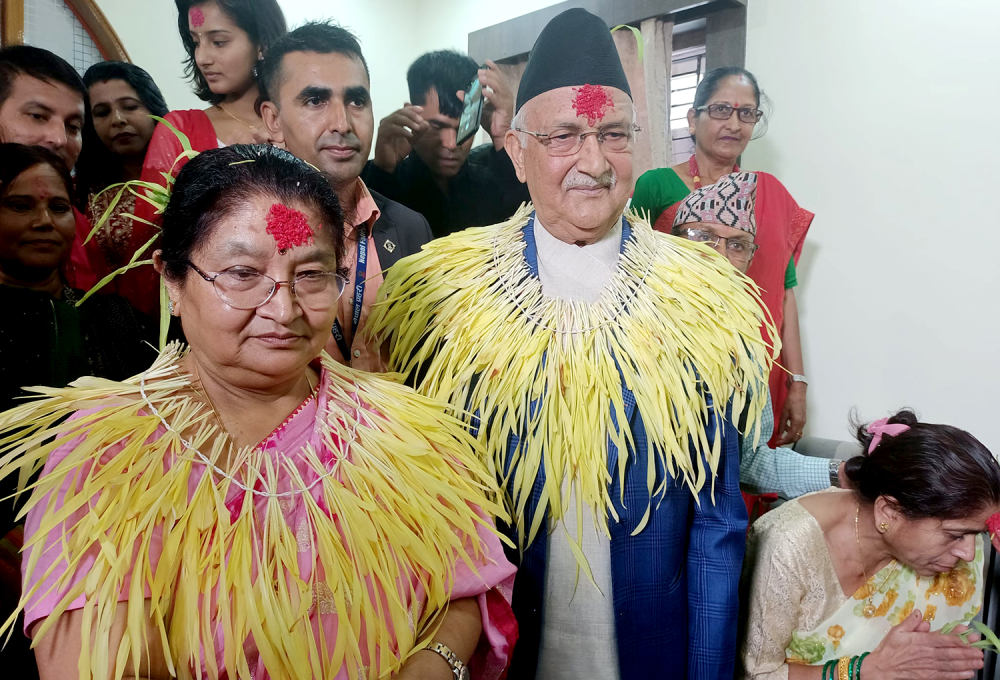 टीका लगाउन पार्टीका स्थानीय नेता, कार्यकर्ता, समर्थक, शुभेच्छुक दमकस्थित ओली निवास पुगेका थिए । ओलीले उनीहरूलाई टीका र प्रसाद प्रदान गरेका थिए ।