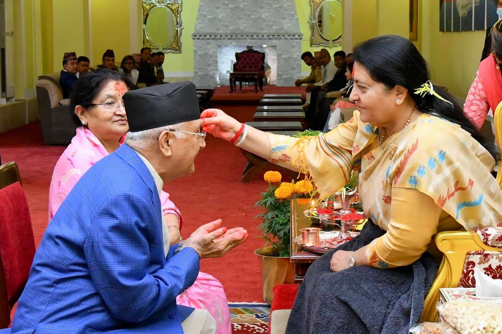मुख्य राजनीतिक दलका नेतामध्ये ओली मात्र राष्ट्रपतिका हातबाट टिका लगाउन पुगेका हुन् । प्रधानमन्त्री शेरबहादुर देउवाले भातृ शोकका कारण टीका लगाएनन् भने पूर्व प्रधानमन्त्री पुष्पकमल दाहाल प्रचण्डले कहिल्यै पनि कसैसंग गएर टिका लगाउने गरेका छैनन् । अन्य शिर्ष नेताहरु पनि कोही राष्ट्रपतिसंग टिका लगाउन नआएको राष्ट्रपति कार्यालयले जनाएको छ ।