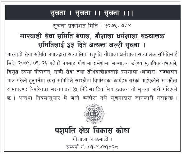 काठमाडौँ, ४ कात्तिक । पशुपति क्षेत्र विकास कोषले काठमाडौंस्थित गौशाला धर्मशालामा मापदण्डविपरीत बनाइएका संरचना हटाउन निर्देशन दिएको छ ।