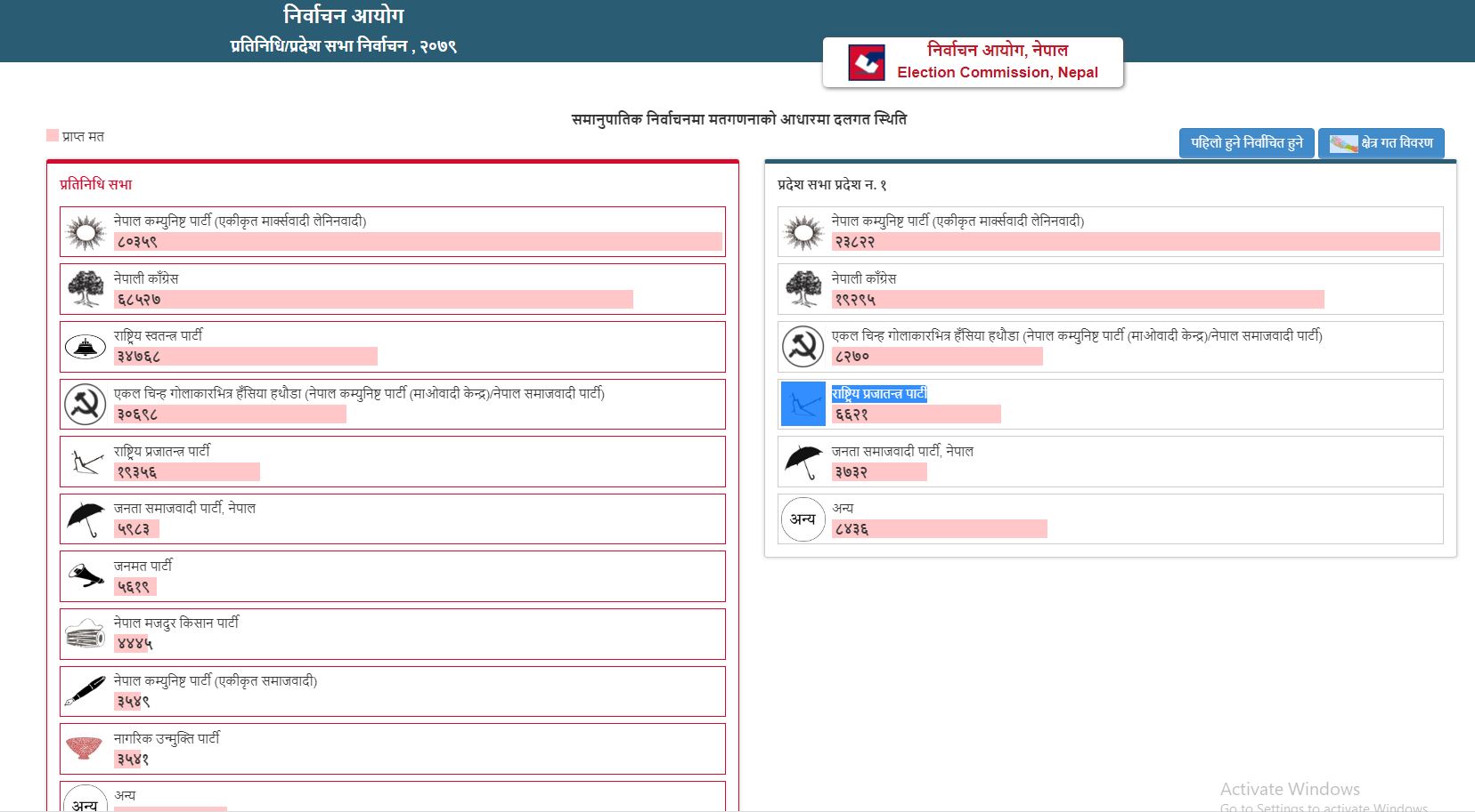 निर्वाचन आयोगको तथ्यांकअनुसार अहिलेसम्म गणना भएको मतमा नेकपा एमाले अगाडि छ। एमालेले ८० हजार ३ सय ५९ मत कटाएको छ। अर्थात् दोस्रोमा नेपाली कांग्रेस छ। कांग्रेसको मत ६८ हजार ५ सय २७ छ। समानुपातिक तर्फ तेश्रो स्थानमा भने रवि लामिछानेको राष्ट्रिय स्वतन्त्र पार्टी छ।