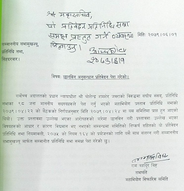 काठमाडौं, २१ मंसिर । प्रतिनिधिसभाका निवर्तमान सभामुख अग्नीप्रसाद सापकोटाले निलम्बित प्रधानन्यायाधीशमाथि अध्ययन गर्न बनाइएको समितिको प्रतिवेदन संसदमा पेश गर्न निर्देशन दिएका थिए । उनले गत १ असोजमा संसदको महासचिवलाई प्रतिवेदन संसदमा पेश गर्ने व्यहोराको पत्र पठाएका थिए ।