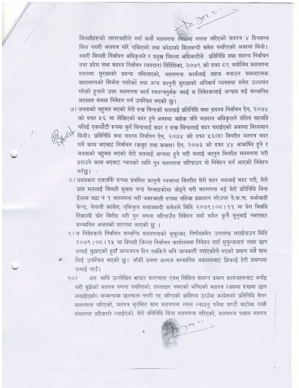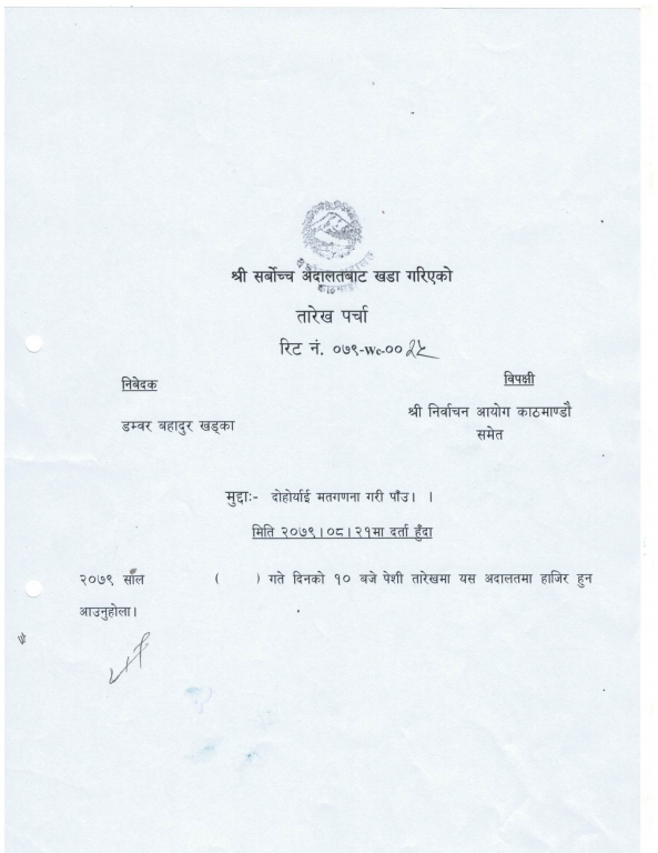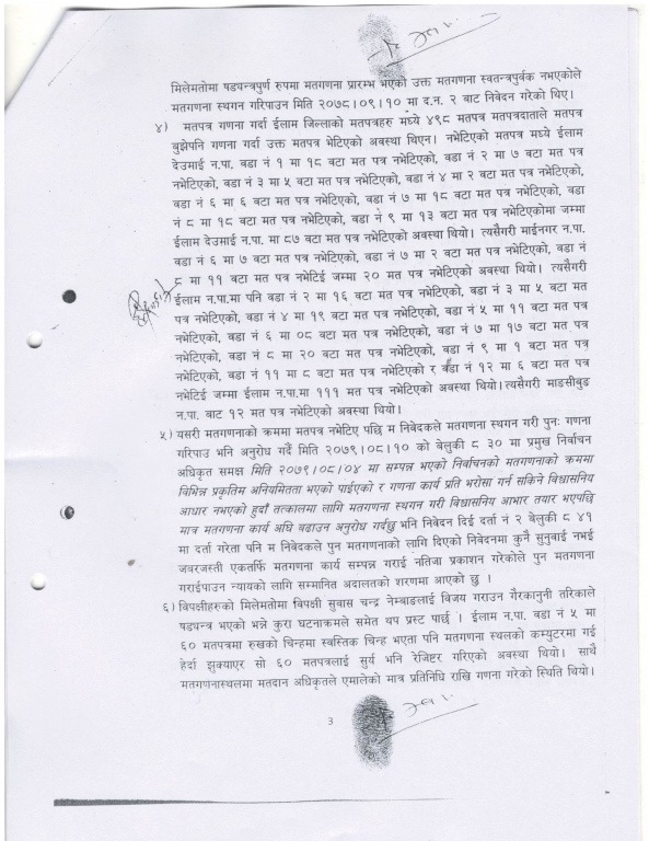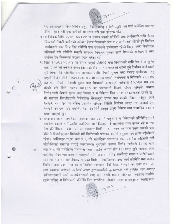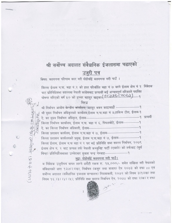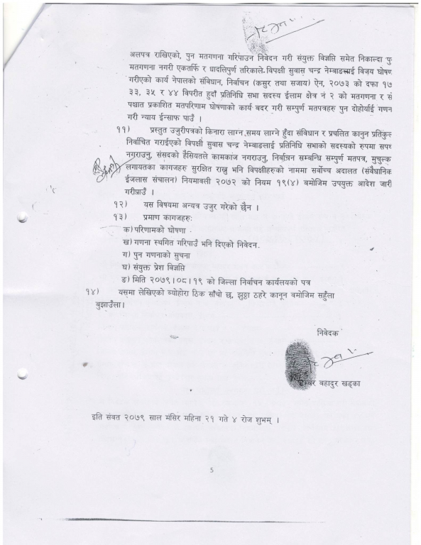मतगणनामा धाँधली गरी एमाले उम्मेदवार सुवासचन्द्र नेम्वाङलाई जिताएको भन्दै खड्काले निर्वाचित घोषणा बदर र पुनः मतगणनाको माग गर्दै बुधबार सर्वोच्चमा रिट हालेका हुन् ।