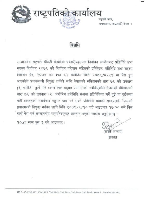 ‘प्रधानमन्त्री नियुक्त गर्नका लागि नेपालको संविधानको धारा ७६ को उपधारा (१) बमोजिम कुनै पनि दलले स्पष्ट बहुमत प्राप्त गरेको नदेखिएकोले नेपालको संविधानको धारा ७६ को उपधारा (२) बमोजिम प्रतिनिधि सभामा प्रतिनिधित्व गर्ने दुई वा दुईभन्दा बढी दलहरूको समर्थनमा बहुमत प्राप्त गर्न सक्ने प्रतिनिधि सभाको सदस्यलाई नेपालको प्रधानमन्त्री नियुक्त गर्नका लागि मिति २०७९ ।९।१० गते आइतबार १७ बजेभित्र दावी पेश गर्न सम्माननीय राष्ट्रपतिज्यूबाट आह्वान भएको व्यहोरा अनुरोध छ’, राष्ट्रपति कार्यालयले जारी गरेको विज्ञप्तिमा उल्लेख छ ।