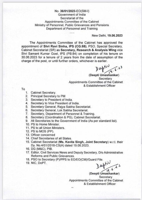 Ravi Sinha, a 1988 batch Indian Police Service (IPS) officer, was previously serving as the Additional Secretary in the Ministry of Home Affairs. Now, he will take the position of Samant Goel on 30th June. His tenure will be for two years.
