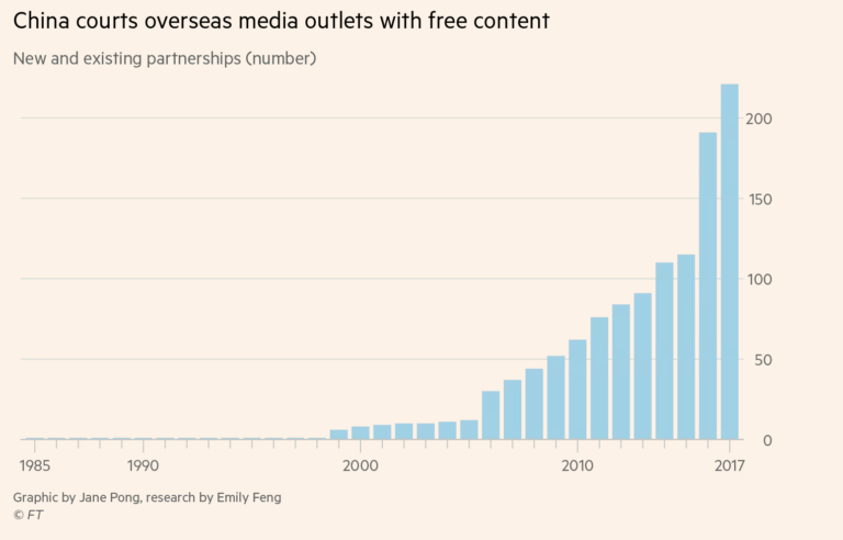 A Financial Times investigation found that party-affiliated outlets were reprinting or broadcasting their content in at least 200 nominally independent Chinese-language publications around the world. Under such agreements, these publications now reach millions of readers outside China each year, rivalling the subscription pools for all of the world’s largest newspapers. “Chinese-language media and the Chinese people are one,” Lu Hao, the managing editor of the American newspaper Sino-US Times, told editors at a forum promoting China’s Belt and Road infrastructure initiative last year. When it comes to promoting the Communist party’s geopolitical interests abroad, he added: “Chinese-language media have an incomparable advantage, due to a shared language, culture, and customs.”