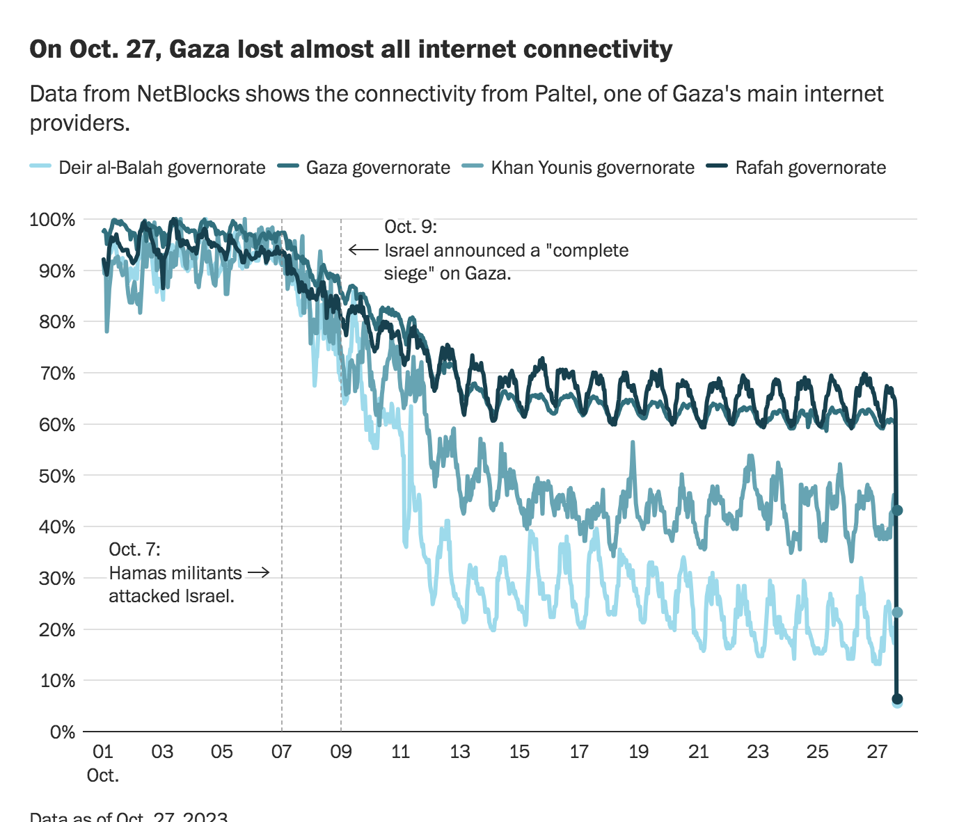 By October 16, most sectors in the Gaza Strip had experienced a 90 percent drop in power availability since October 6.