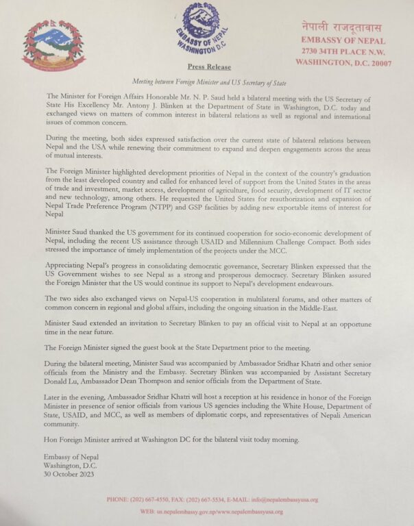 Foreign Minister NP Saud, during the joint press conference, also mentioned the long and strong relationship between Nepal and the United States. He said, ‘The United States is a development partner for Nepal. The United States has provided assistance in many areas.’ He urged for more American support in trade and investment, market access, food security, and Generalized System of Preferences (GSP) reinstatement. The conversation also revolved around the $500 million Millennium Challenge Corporation (MCC) project implementation in Nepal, and the additional U.S. assistance related to the 10 Nepali deaths during the Hamas attack in October.