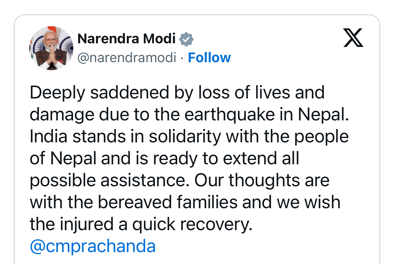 “India stands in solidarity with the people of Nepal and is ready to extend all possible assistance,” the Indian Prime Minister has said in his tweet,” Our thoughts are with the bereaved families and we wish the injured a quick recovery.”