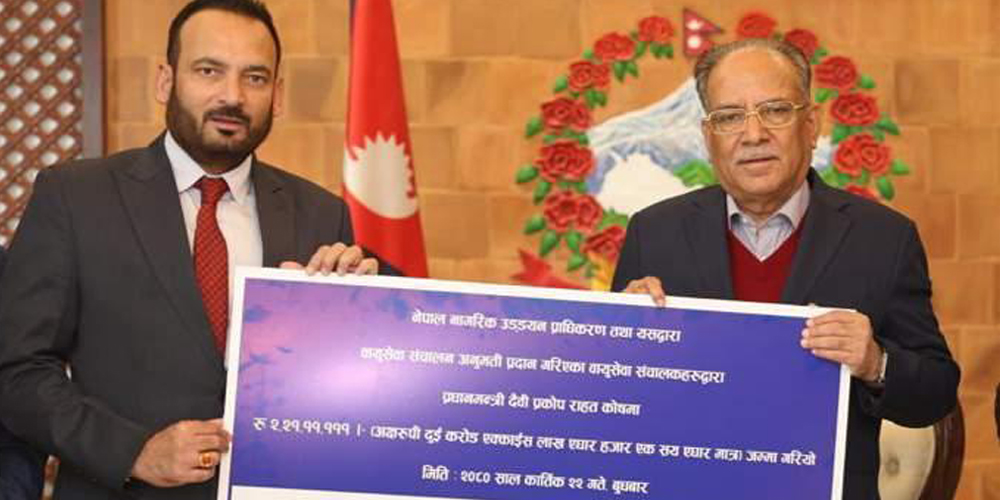 A delegation from the CAAN also comprising Director General Pradeep Kumar and its staff today visited the Prime Minister at his official residence in Baluwatar to hand the cheque. The funds will be deposited in the Prime Minister Disaster Relief Fund, according to CAAN Spokesperson Jagannath Niraula.