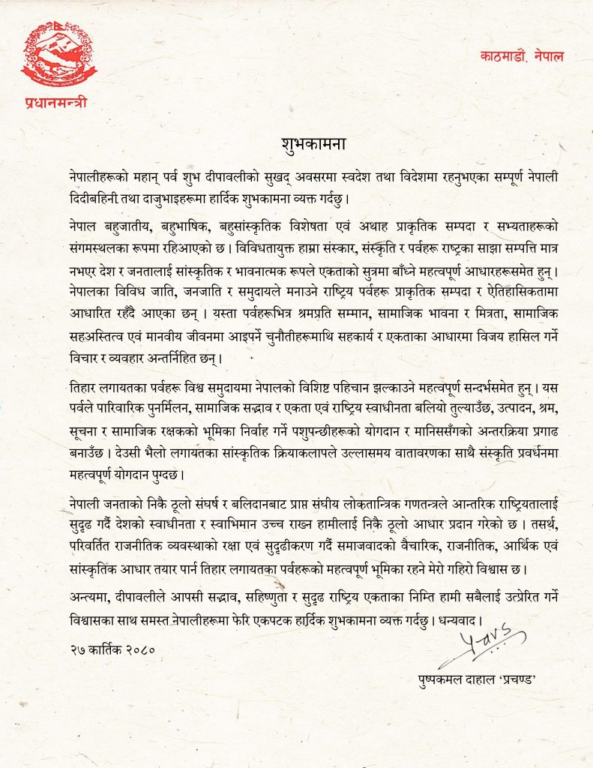 Extending best wishes on the occasion of the Deepawali today PM Prachanda made the remarks.