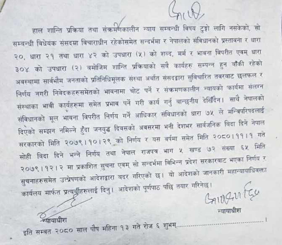 The Supreme Court stated, “When the basic essence of the constitution is to refrain from making decisions contrary to the fundamental principles of the constitution, and considering that Article 75 of the constitution provides the Cabinet the right to make decisions, only when the understanding is not reached, the decision to declare a public holiday nationwide on the occasion of People’s War Day is contrary to the constitution. The decision made by the Nepal government on 2079/10/29 BS and the decision to continue the same holiday this year, as published in the Nepal Gazette, Section 5, Part 72, Number 65 dated 2079/12/2 BS, along with various decisions and information from different provincial governments, have been annulled through the writ petition order.”