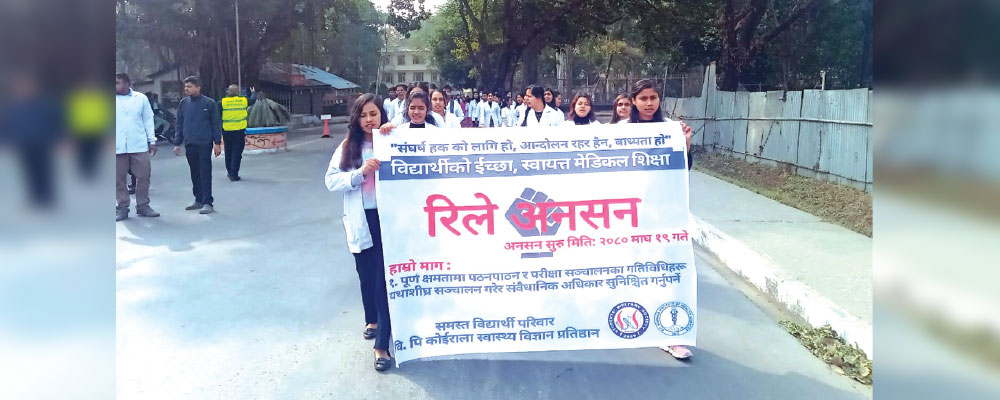 Dharan, Feb. 7: The atmosphere has been tense at the BP Koirala Institute of Health Sciences, Dharan, as students have resorted to a relay hunger strike, advocating for the swift resumption of their studies.