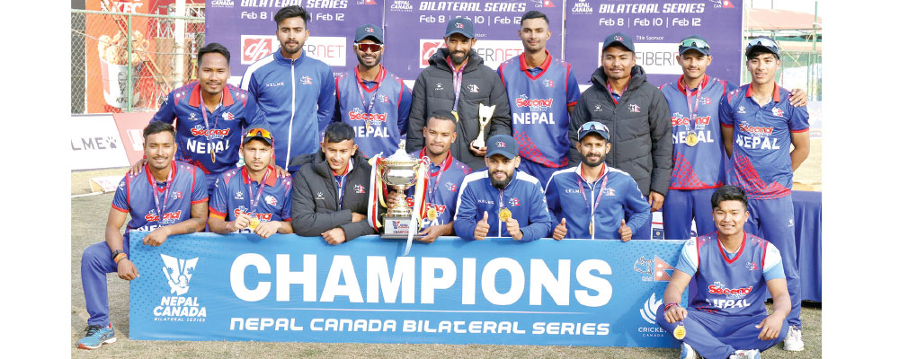 Kathmandu, Feb. 13: Having already won the Bilateral Series with two consecutive wins against Canada, Nepal was playing the third match for a clean sweep in Kathmandu on Monday. A maiden century each from Opener Anil Sah and Number three batter Bhim Sarki made it possible as Nepal notched up a nine-wicket victory over Canada. On a day when Anil and Bhim put on a record partnership with two centuries in the same innings, Nepal achieved its first historic clean sweep on home soil. Nepal claimed the first match by seven runs and the second match by seven wickets.