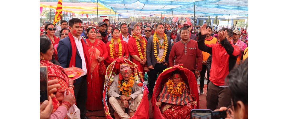 The locals honoured the Shrestha family, who supported the campus by providing the highest amount of money, by playing musical instruments and taking them around Galkot Bazaar.