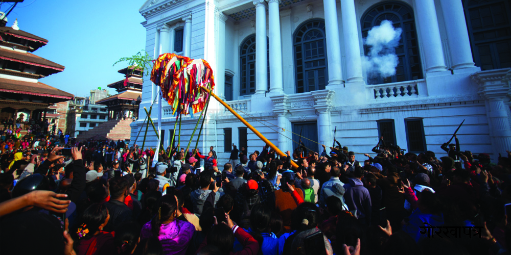 A wooden pole ‘Chir’ was erected at the Hanumandhoka Palace premises at 7:47 AM this morning.