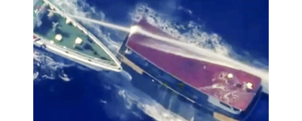 Philippines, Mar. 24:Two Chinese coast guard ships fired at a Philippine supply boat with water cannon Saturday in the latest confrontation near a disputed South China Sea shoal, causing heavy damage to the wooden vessel, Philippine officials said.