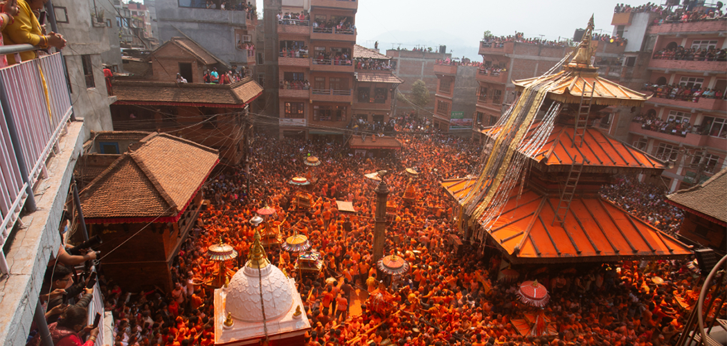 During the procession, red vermillion (a blood-red powder) powder and other colours are thrown at each other by the participants of the procession, which is known as Sindoor Jatra.