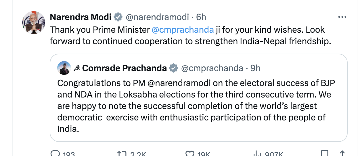Kathmandu: Indian Prime Minister Narendra Modi is poised to secure a consecutive third term in office, the country’s Election Commission projected on Tuesday, making him the second leader to do so since the country declared independence in 1947. “This is a historical feat in India’s history,” Modi wrote on X.