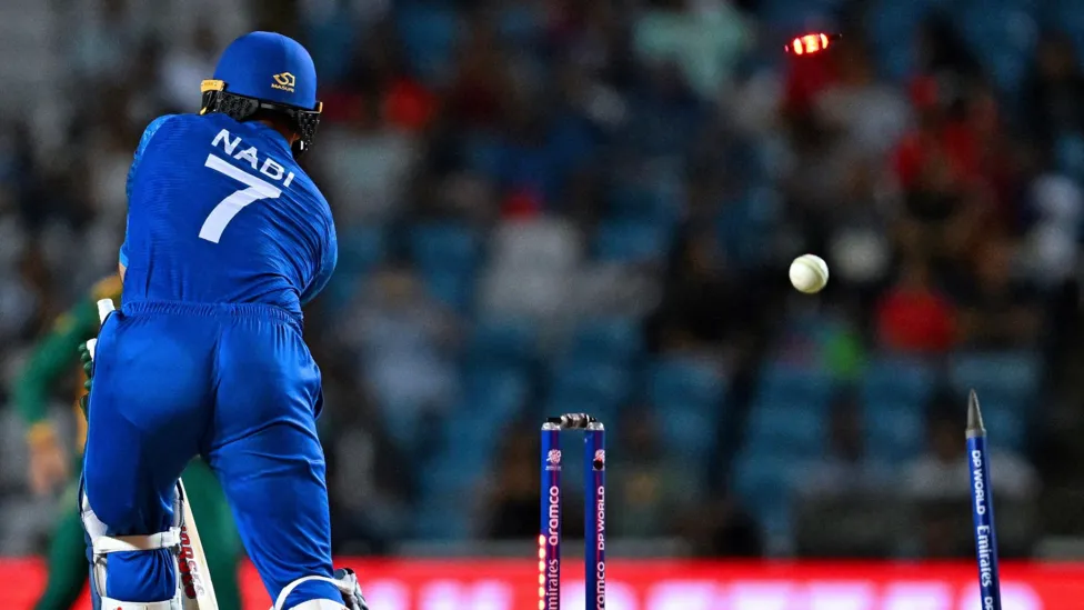 Anrich Nortje also struck in his first over when Azmatullah hit to deep cover and later bowled Rashid as the Afghanistan captain backed away.