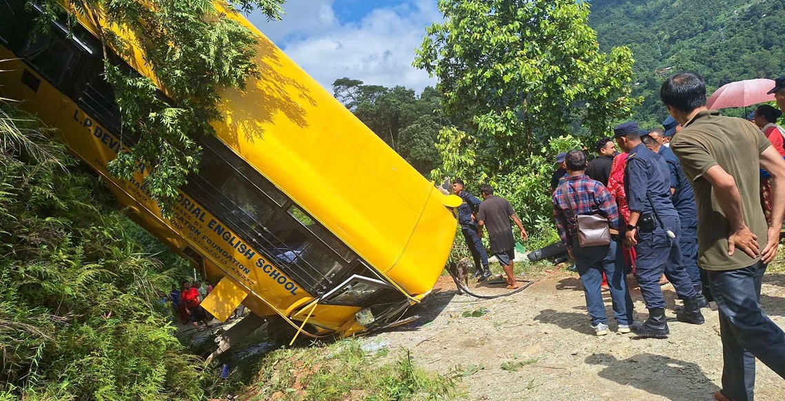 The bus with a registration number (Ga 1 Ka 6319) heading towards Birauta from Ramdi got into an accident at the roundabout of Furshekhola of Pokhara Metropolitan City-21 and veered off some 60 meters down the road. 27 students including the bus driver, co-driver, and a guardian were onboard the bus.