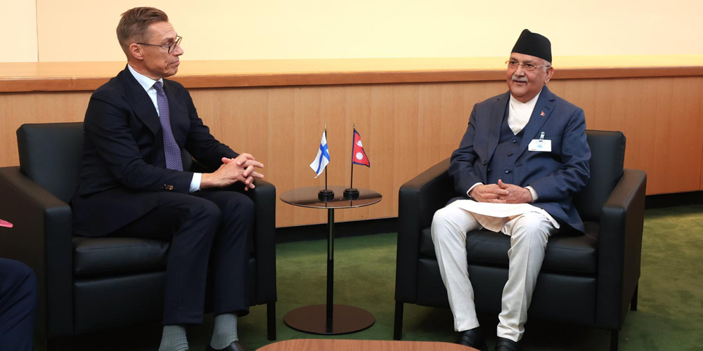 New York (USA), Sept 25: Prime Minister KP Sharma Oli, who is currently in New York to participate in the 79th Session of the United Nations General Assembly (UNGA) leading a Nepali delegation, held a meeting with Finland’s President, Alexander Stubb on Tuesday.