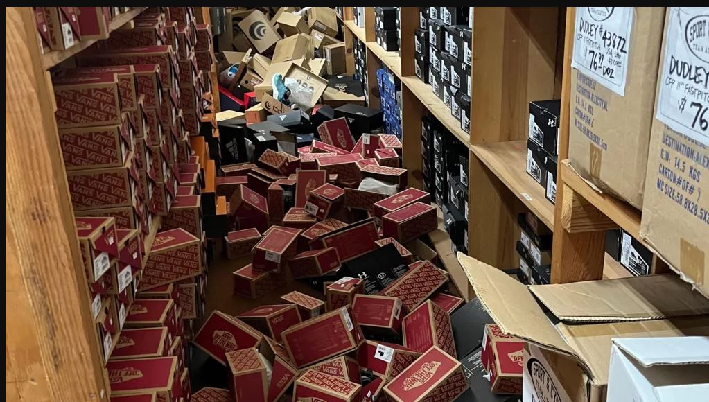 Boxes of shoes flew off the shelves in the shaking. Photo: Todd Dunaway