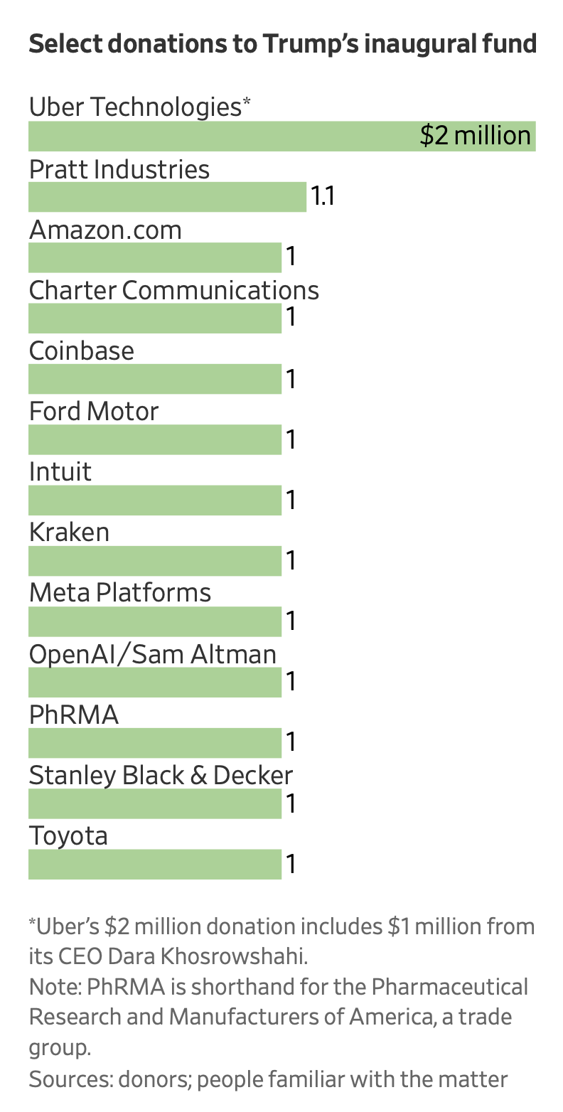 Inauguration officials have told fundraisers that they are on track to raise more than the $107 million they brought in for Trump’s first inauguration. President Biden’s inauguration, in contrast, raised $61 million. Trump’s 2017 inaugural fund received donations of $1 million or more from 18 companies, and this year’s fund is on track to outpace that, people familiar with the fundraising said. The Journal has identified 13 companies that gave $1 million or more so far.