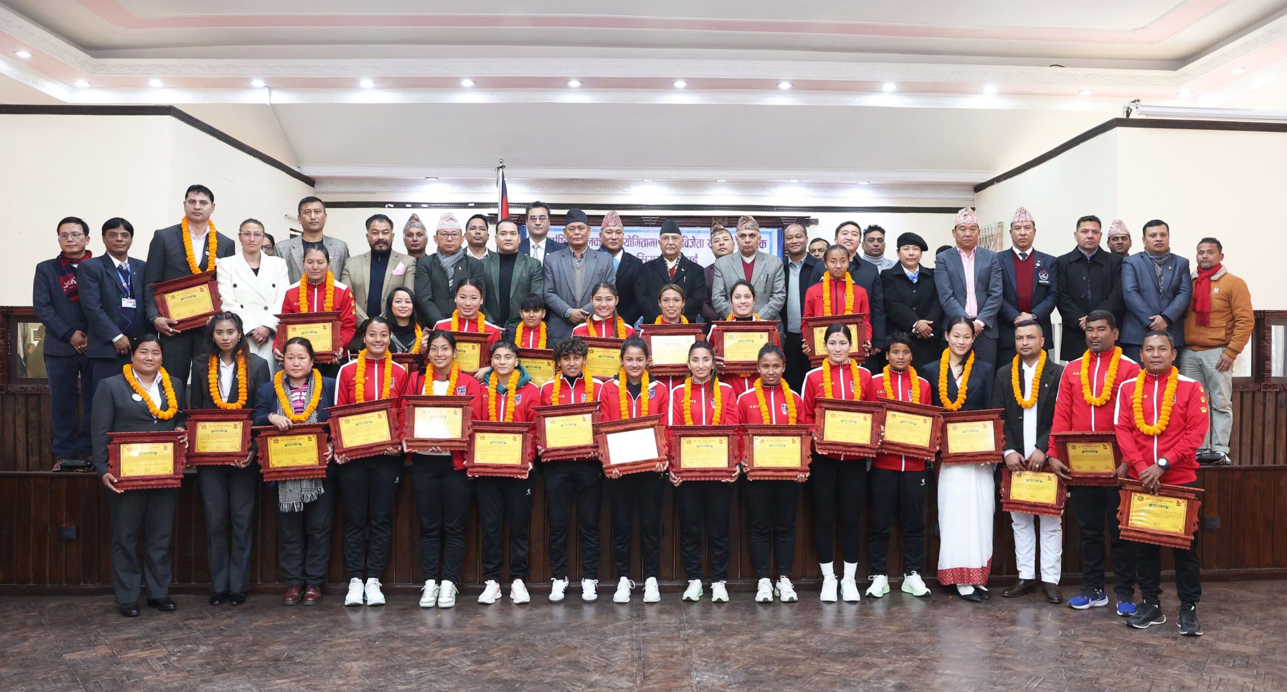 Prime Minister Oli presented prizes to the medal winner of the SAFF Women Football Championship, Amrita Jaisi, main coach Rajendra Tamang and manager Brinda Dewan. The Football Championship was held in Kathmandu from October 17-30, 2024.