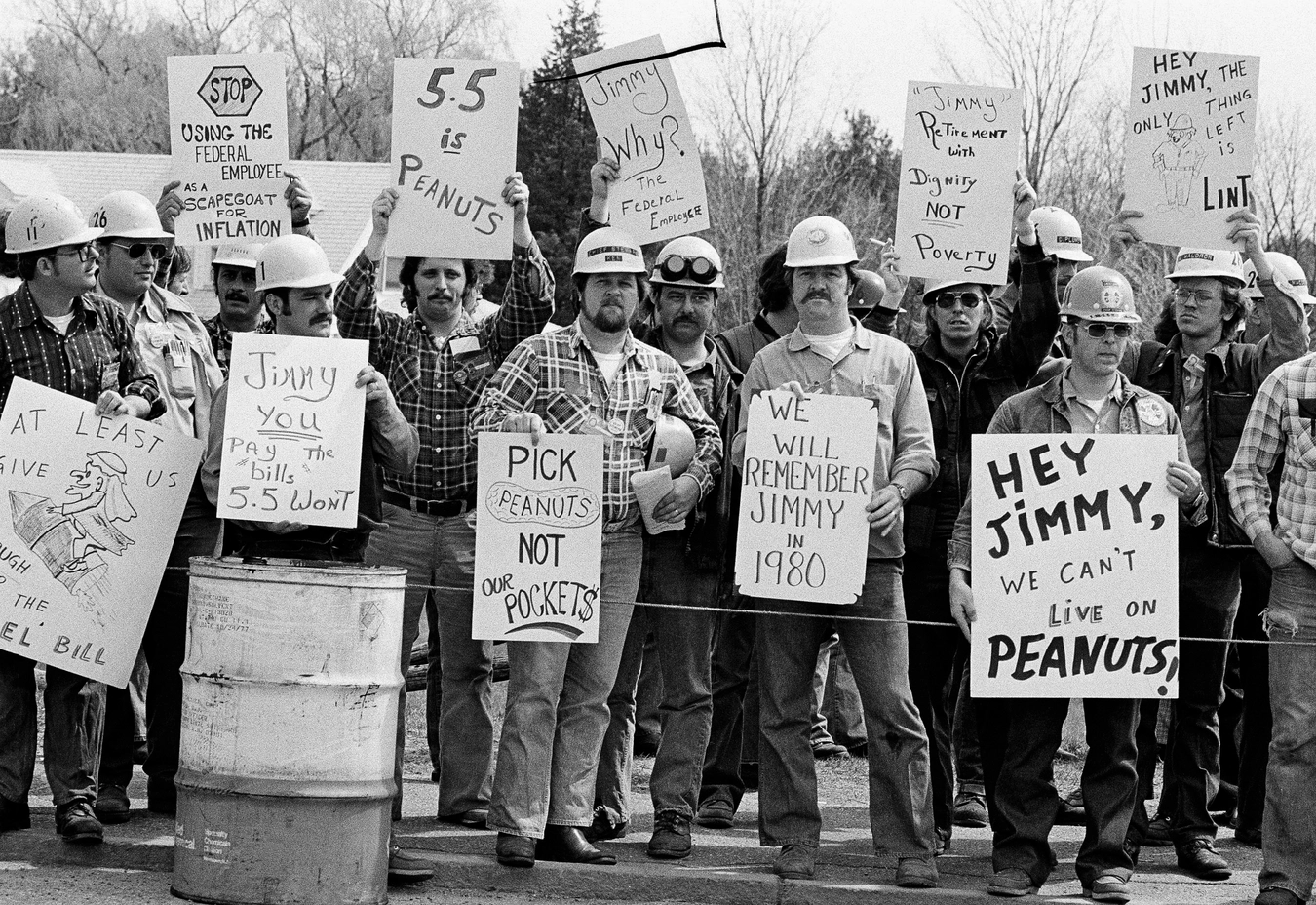 A group of metal trade workers protests against Jimmy Carter’s wage ceiling.