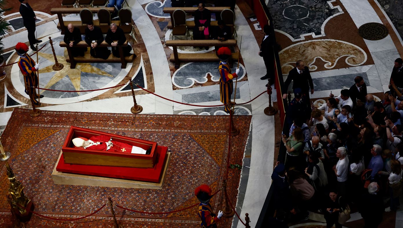 The basilica is bathed in a hushed silence as mourners from across the globe make a slow, shuffling procession up the main aisle to pay their last respects to Francis, who died Monday after a stroke.