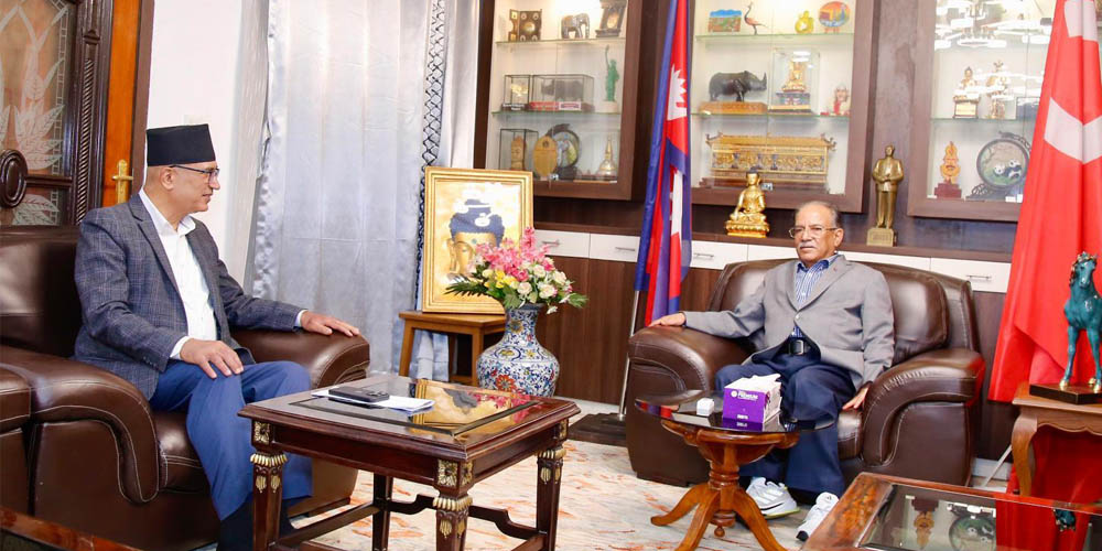 Kathmandu, May 6: CPN (Maoist Centre) Chair and former Prime Minister Pushpa Kamal Dahal ‘Prachanda’ and Deputy Prime Minister and Finance Minister Bishnu Prasad Paudel held a meeting today.