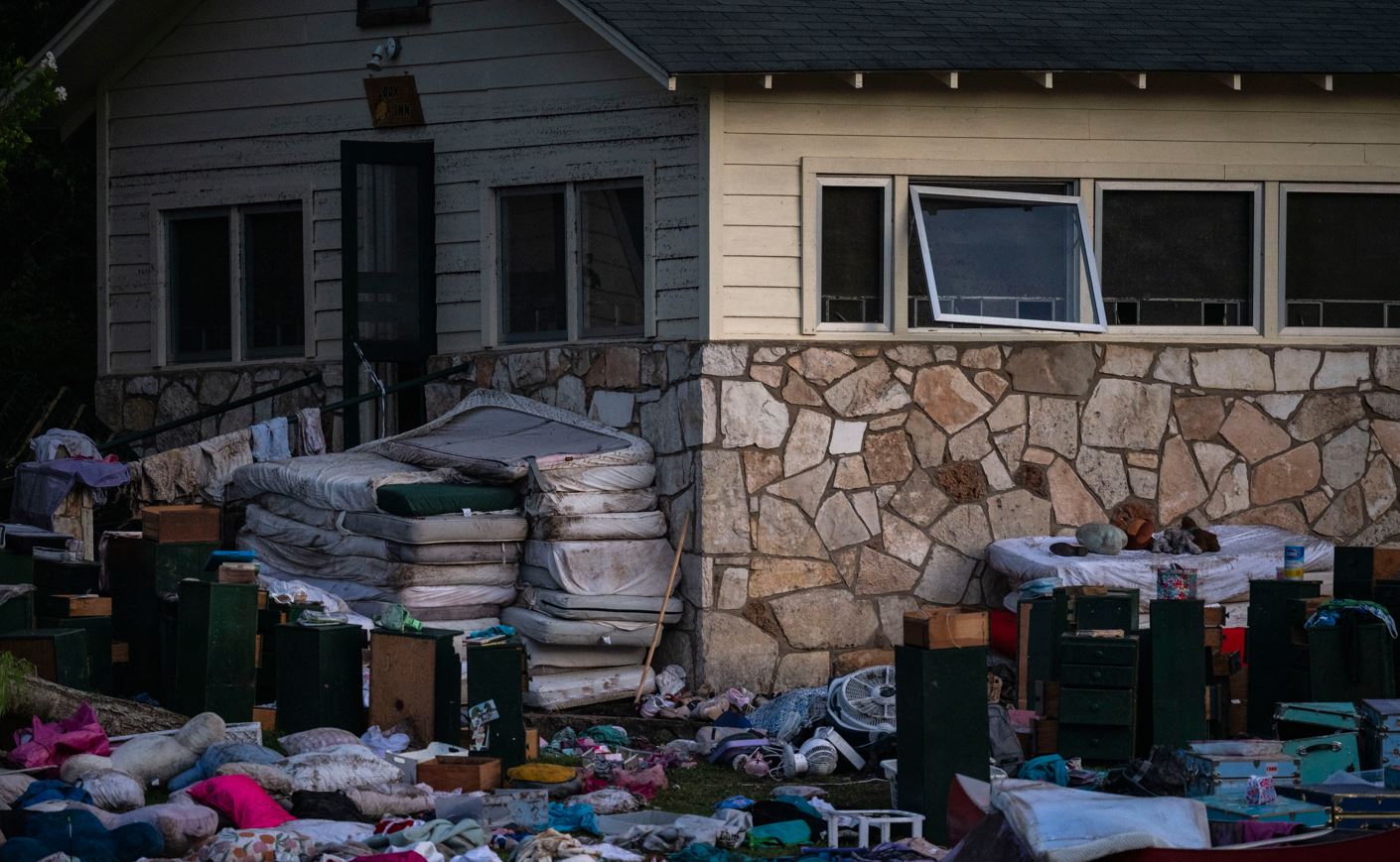 Outside the cabins at Camp Mystic where the girls had slept, mud-splattered blankets and pillows were scattered on a grassy hill that slopes toward the river. Also in the debris were pink, purple and blue luggage decorated with stickers.